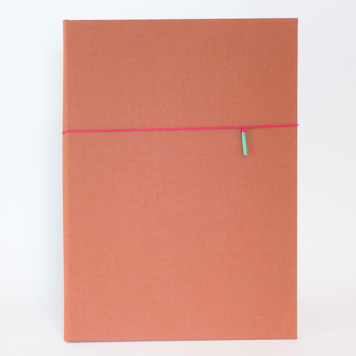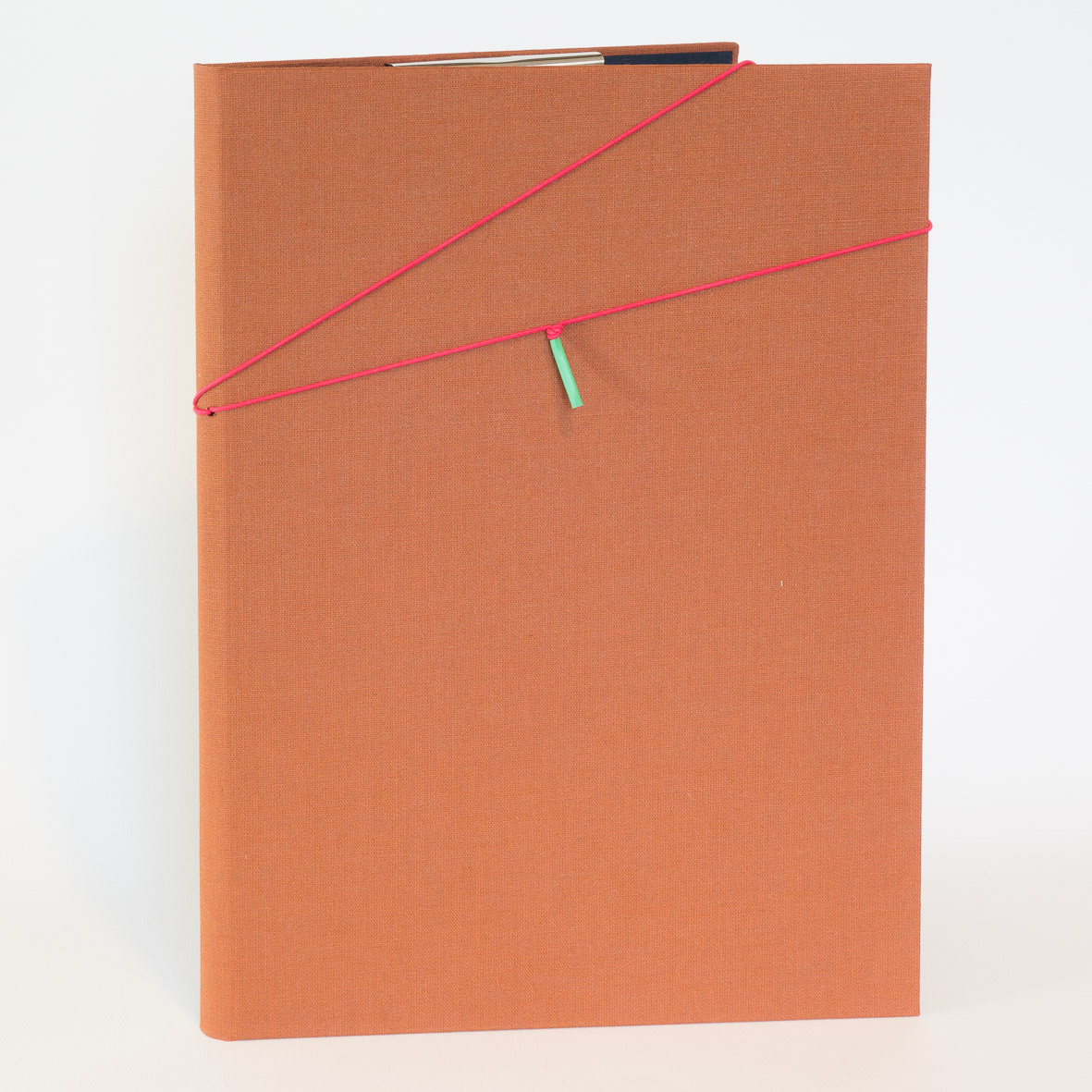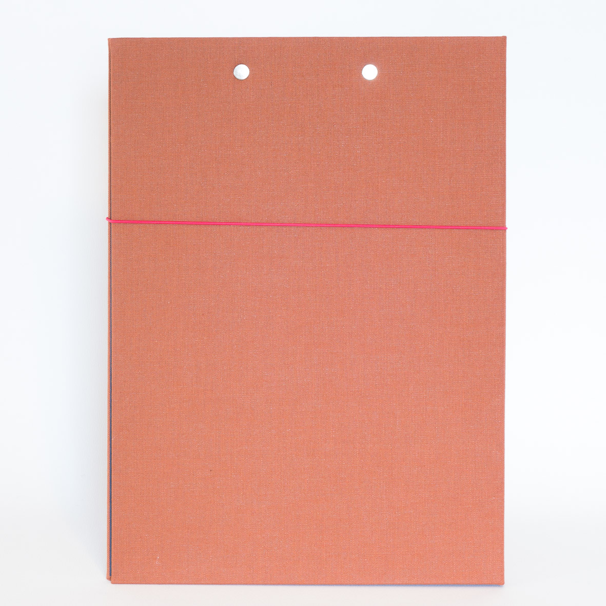 Mappe für Format A5, Außenmaße: 230 x 170 mm (A5),  mit Einschubtasche, Klemmmechanik und Bleistift; Aussenbezug: Buchbinderleinen, Verschluss: farbiges Gummiband