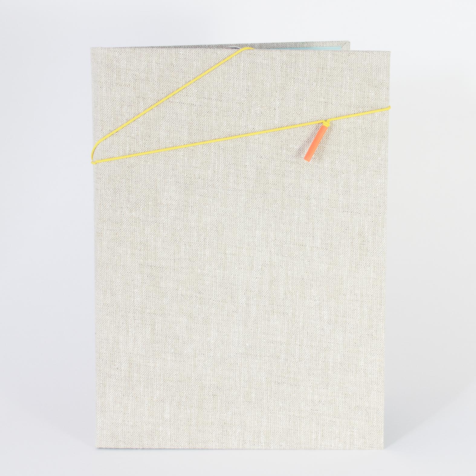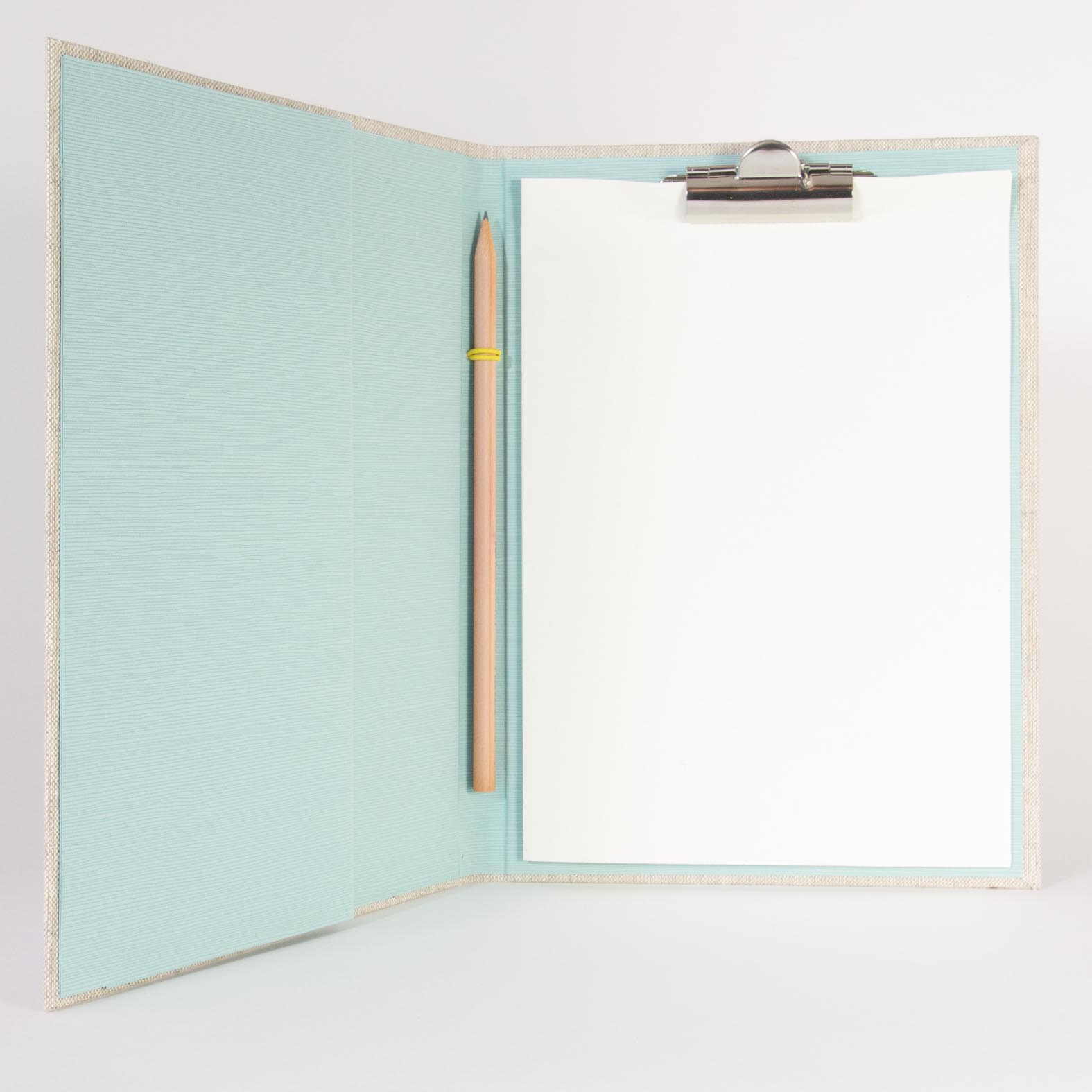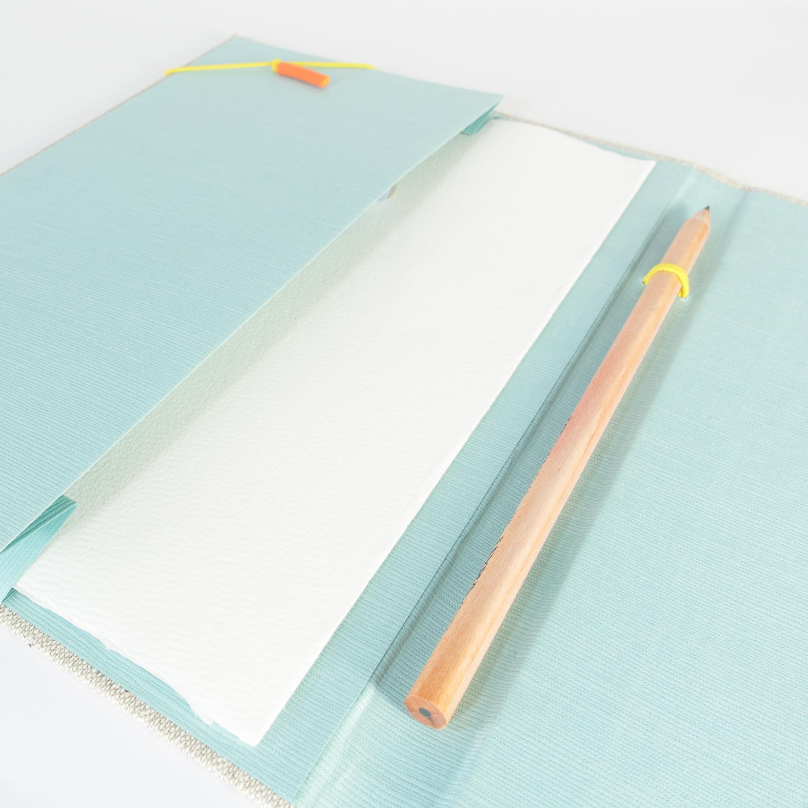Mappe für Format A5, Außenmaße: 230 x 170 mm (A5), mit Einschubtasche, Klemmmechanik und Bleistift; Aussenbezug: Buchbinderleinen, Verschluss: farbiges Gummiband