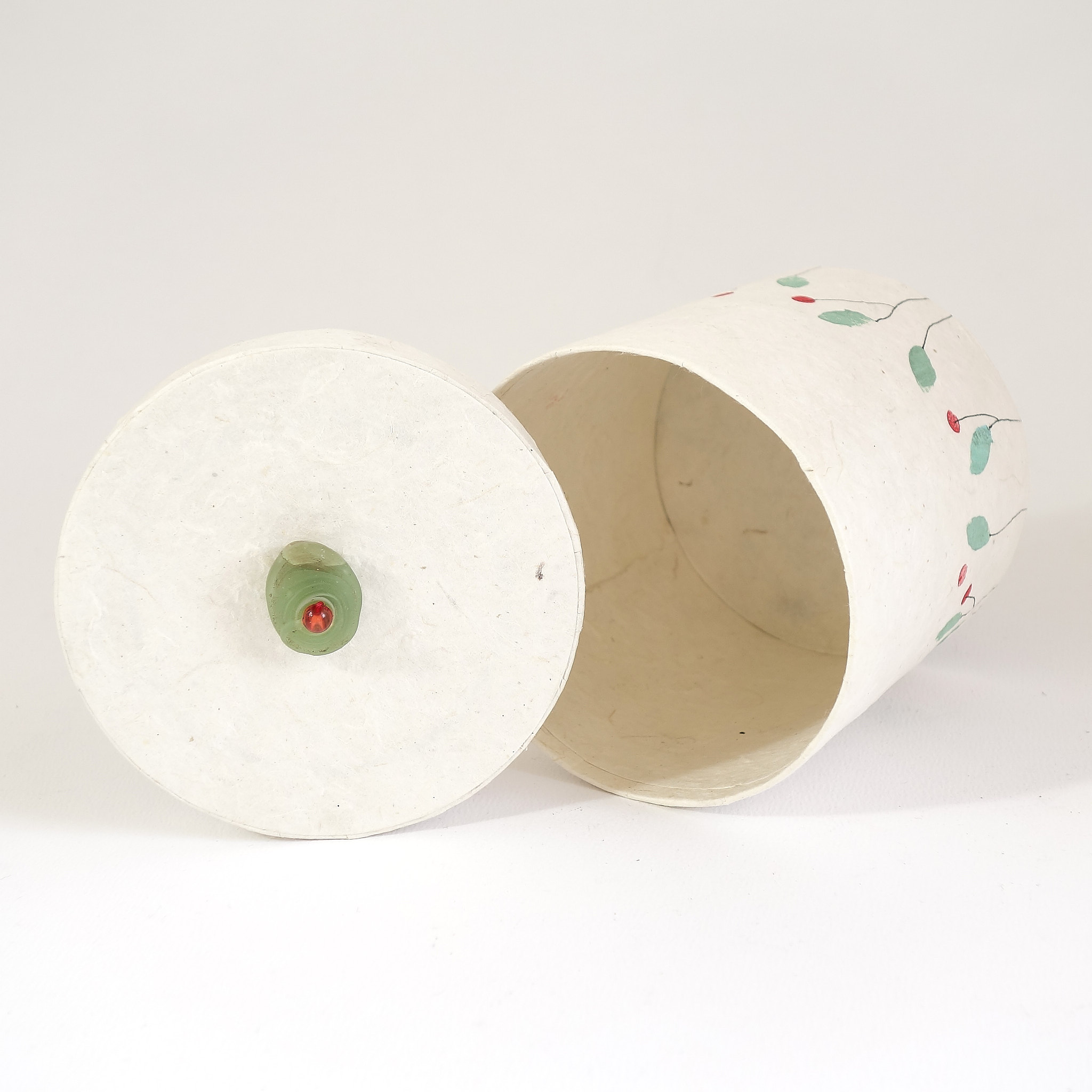 Zylindrische Dose mit Stülpdeckel, Höhe ohne Knauf: 100 mm, Durchmesser 100 mm. Buntpapierbezug mit handgemaltem und gestempleten Dekor.