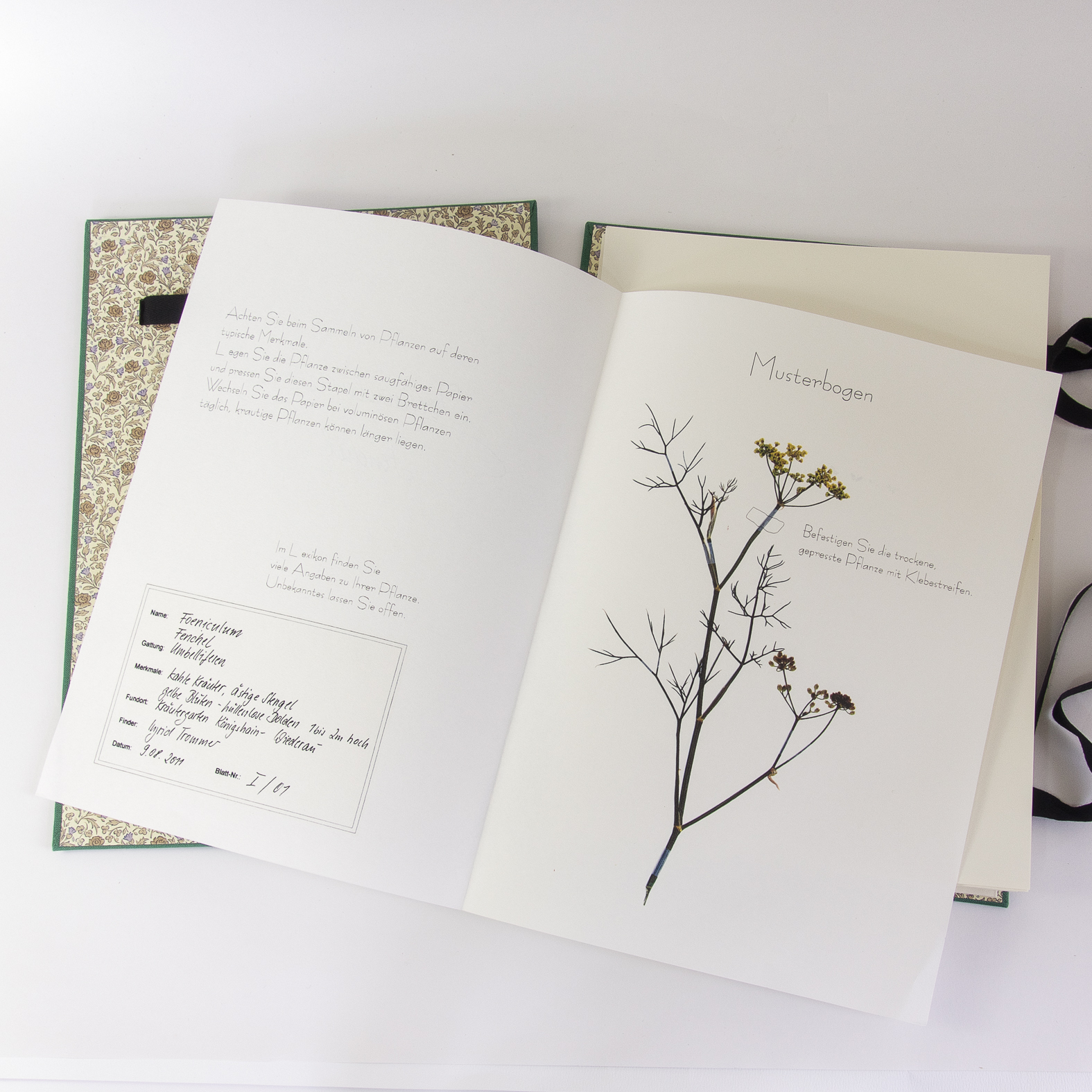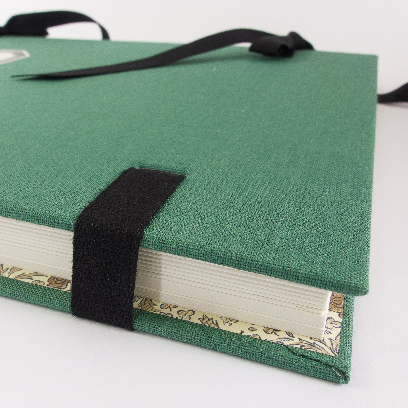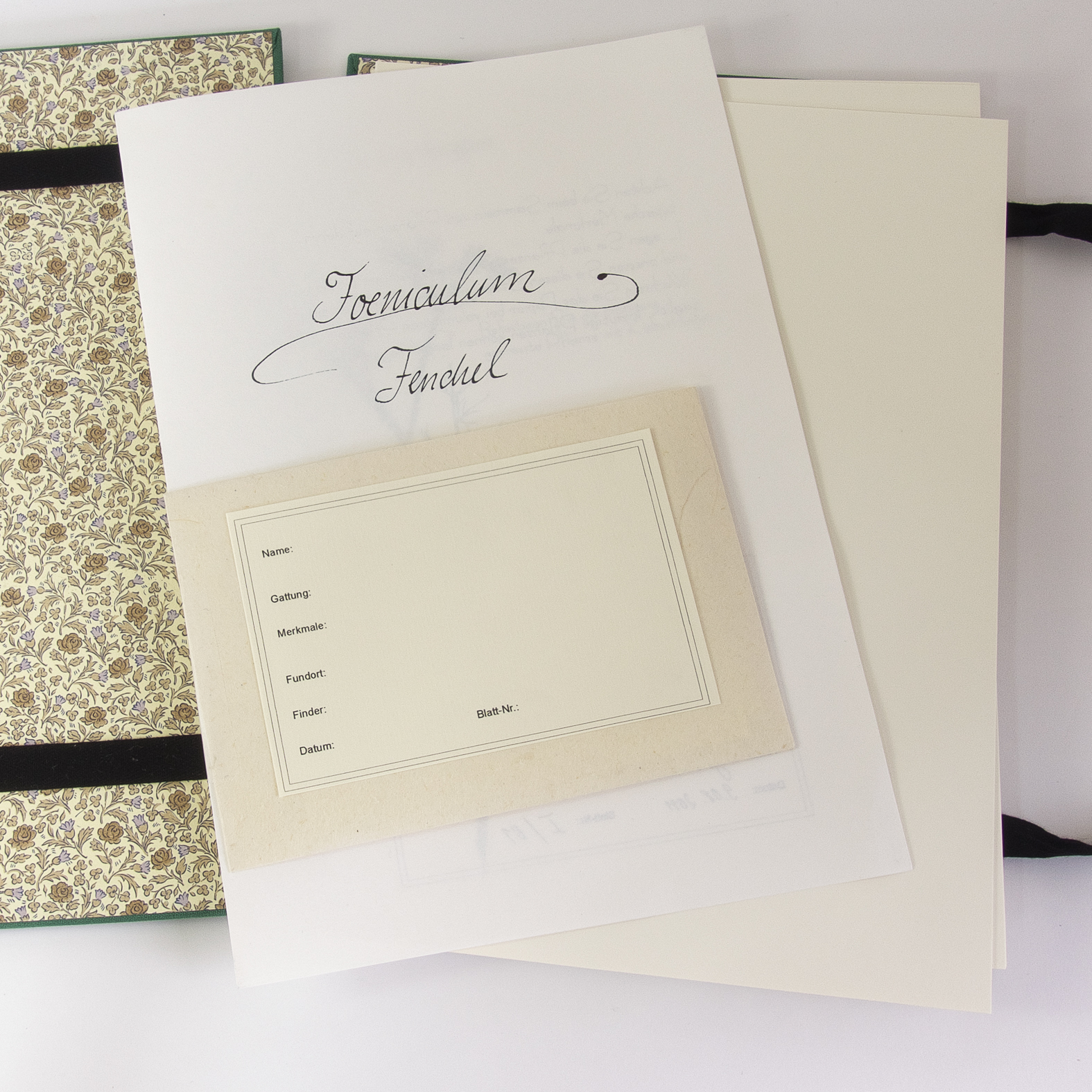 Einfache Mappenkonstruktion (Kladde) mit zwei Zugbändern für eine flexible Höhe, grüner Leinenbezug, innen Carta Varese Papier, 15 leere Falzbögen Format A4 aus säurefreiem Fotokarton 300 g/m², ein gedruckter Musterbogen