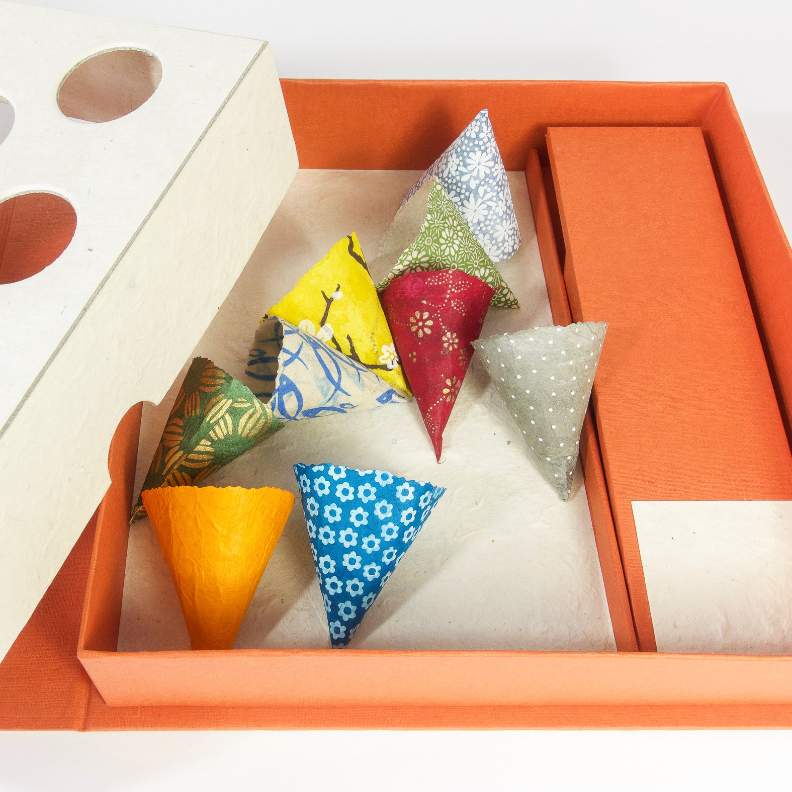 Box im Format 215 x 220 x 55, Wippe, Papierhütchen in verschiedenen Dekoren