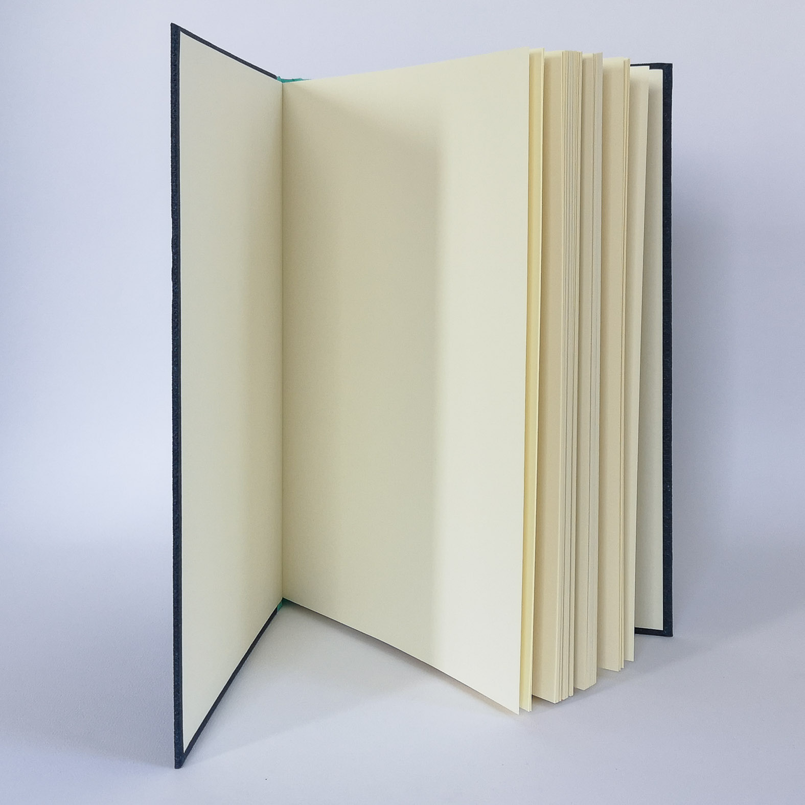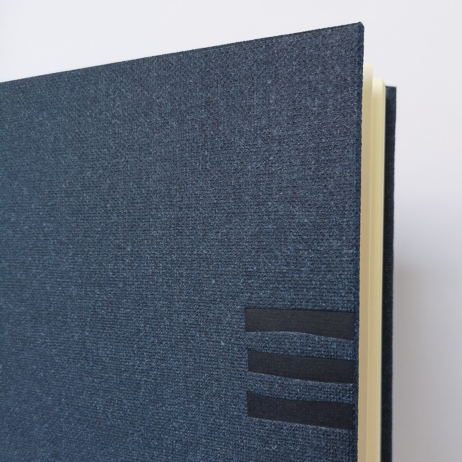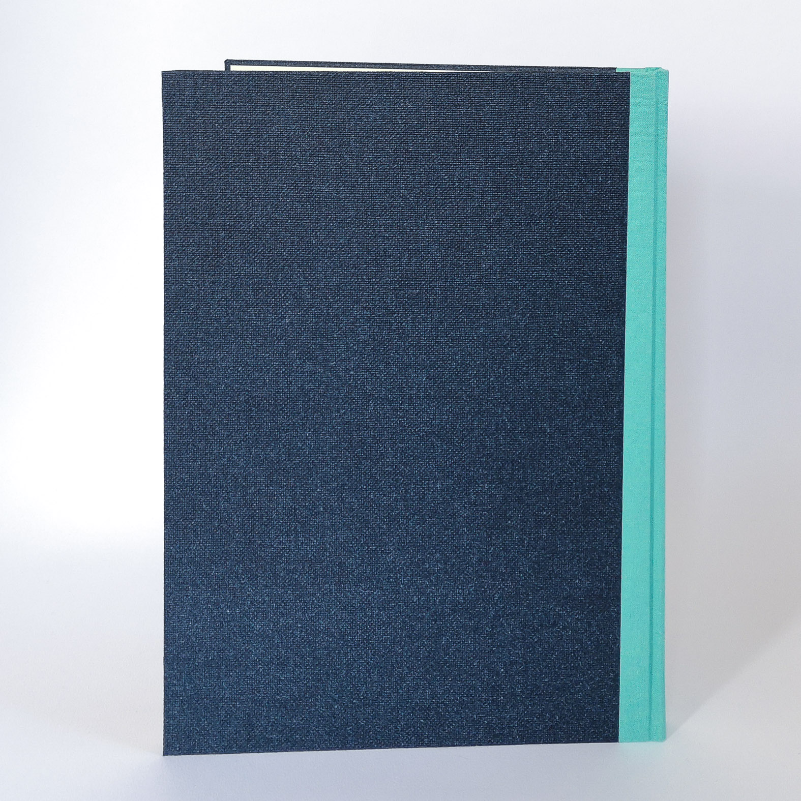 Notizbuch Format 305 x 217 mm (A4), ca. 90 Seiten liniert, fadengehefteter Block, Leinenrücken, Einband aus robustem Papier mit Canvasstruktur, geprägt