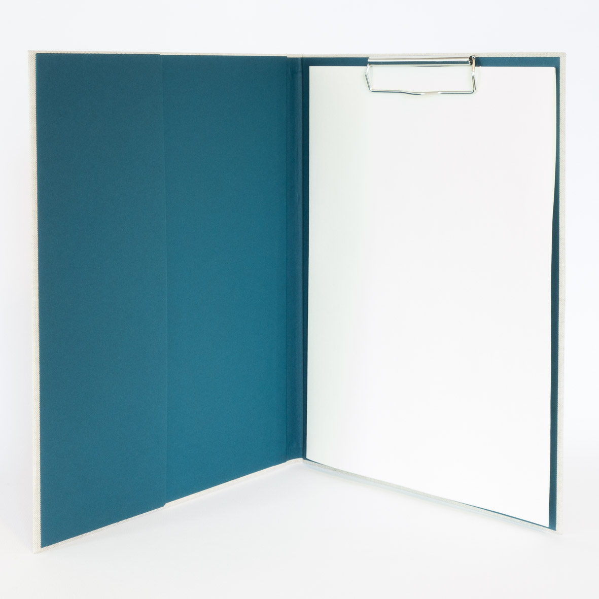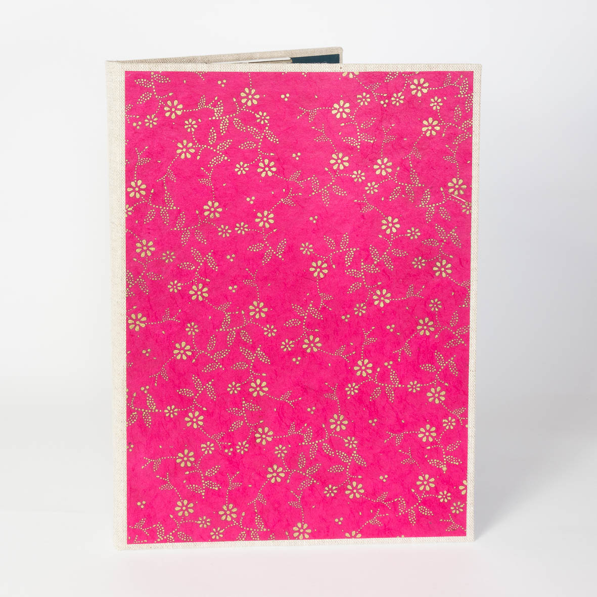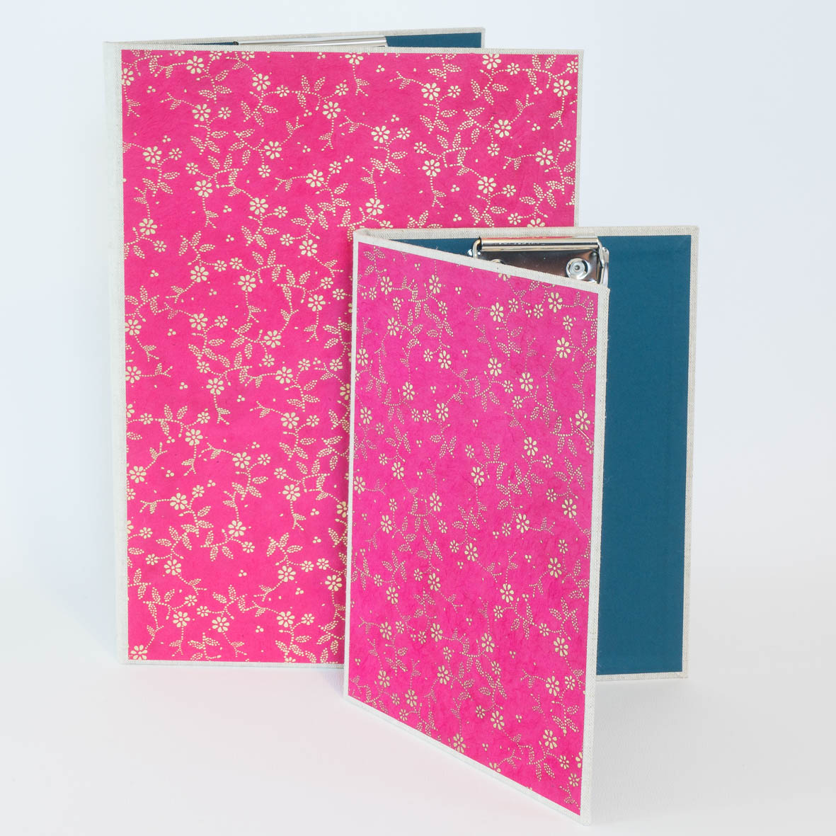 Mappen für Dokumente in Format A4 oder A5, Bezug aus Buchbinderleinen mit floralem Naturpapierdekor. Innen mit Einschubtasche und Klemmmechanik.