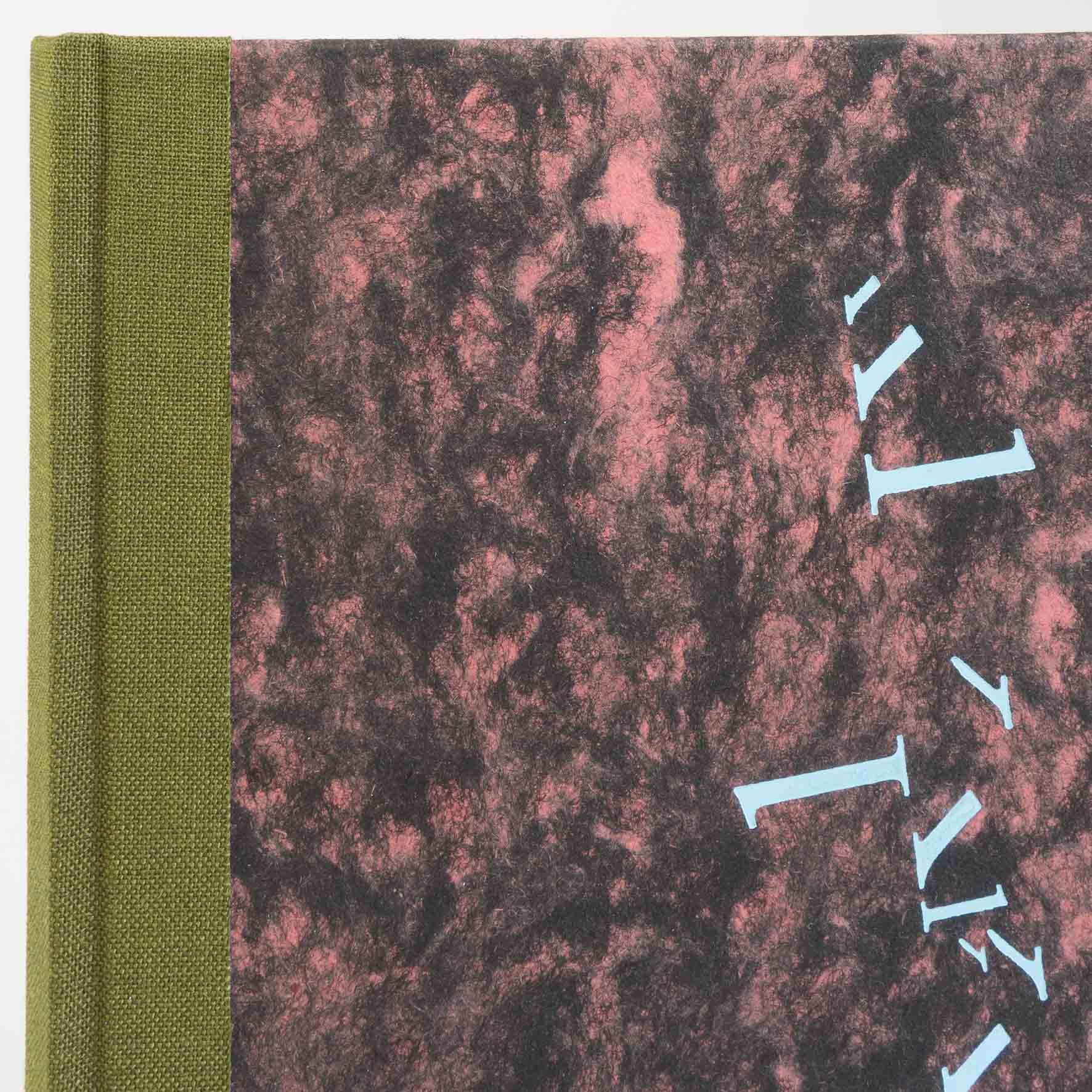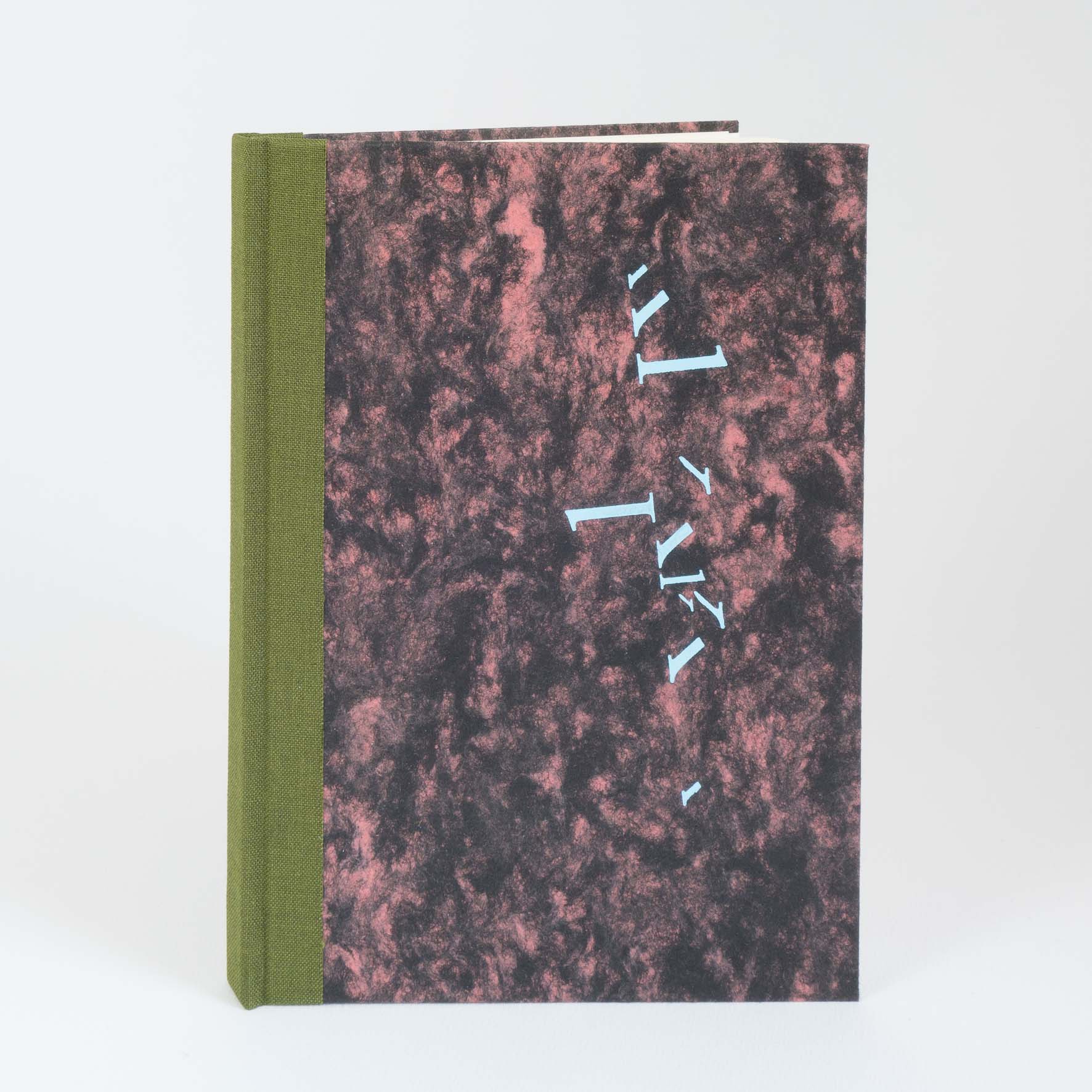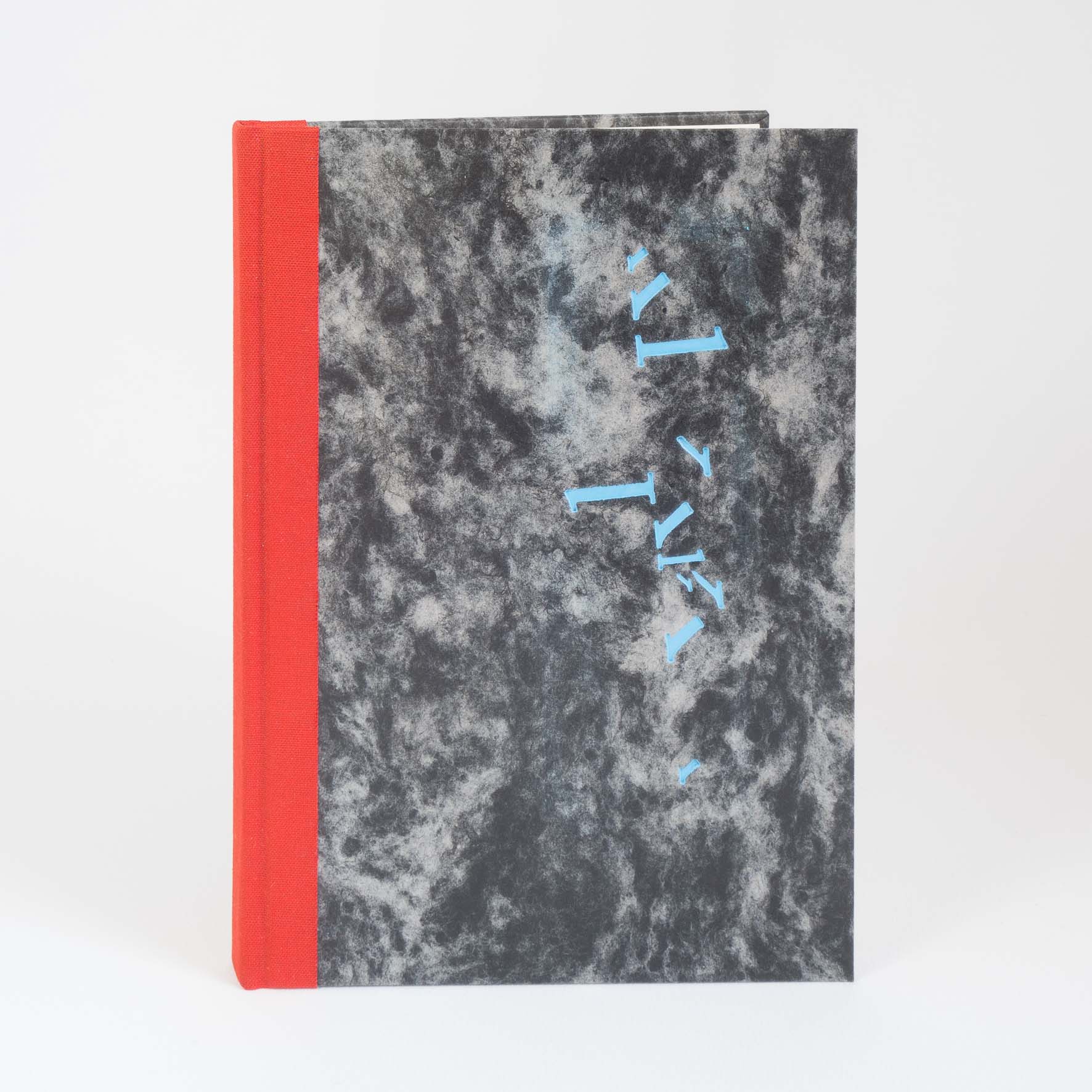 Notizbuch im Format 215 x 152 mm (A5), ca. 70 Seiten liniert, Leinenrücken und Buchdeckelbezug aus klassischem Wolkenmarmorpapier, Prägung.
